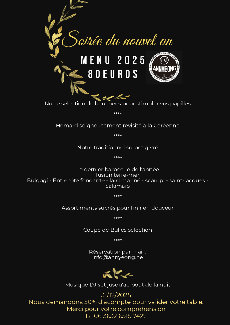 Menu disponible aussi à emporter sur réservation : info@annyeong.be